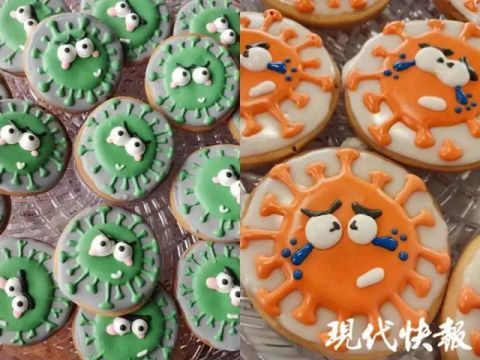 " 這些糖霜餅干之間是有關(guān)聯(lián)的。其中兩款是新冠病毒圖案,一款是很囂張的樣子,一款是被我們打敗的樣子,是靠什么打敗的呢?靠穿防護(hù)服的醫(yī)護(hù)人員,靠打疫苗、測溫和勤洗手 …… 所以另外六款我們做了防護(hù)服、溫度計(jì)這些圖案。" 王洵告訴現(xiàn)代快報(bào)記者,她和同事一起設(shè)計(jì)圖案,邀請會(huì)烘焙的朋友參與制作,并手寫了感謝信,和餅干一起寄出。